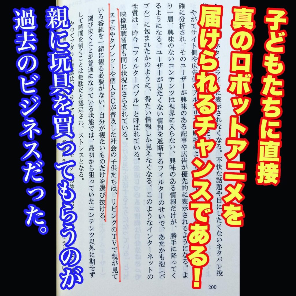 「真の子ども向けロボットアニメ番組を制作するプロデューサー」として未来の若者や子どもたちにどうアプローチするか?という視点でこの本を読んで伝えたいことを選んだ。